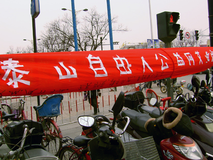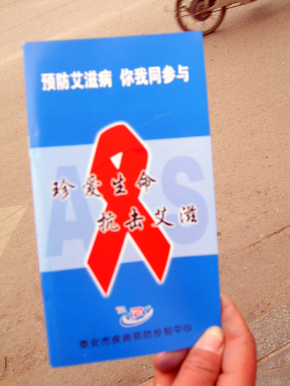 第一次艾滋病宣传活动条幅,至今很佩服山哥,用红布做底,有白纸裁剪出文字贴到红布上,一条简单的自制条幅,诠释着成立时的艰苦与节俭,但这个条幅完美的见证了具有重大意义的一天——泰山义工第一次活动。