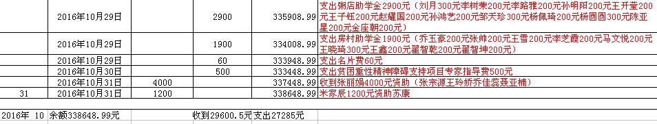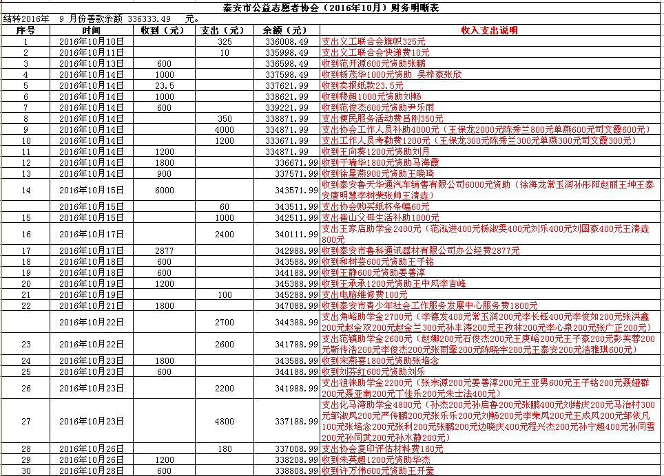 泰安市泰山义工联合会(2016年10月)财务明晰表
