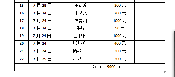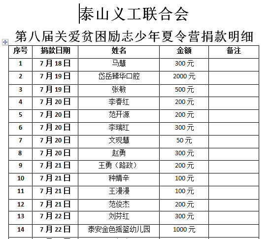 泰安市泰山义工联合会会第八届励志少年夏令营捐款明细