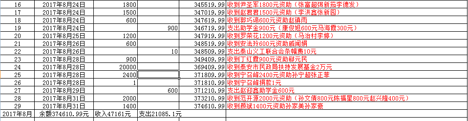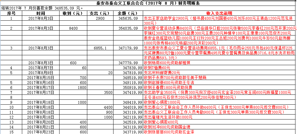 泰安市泰山义工联合会会(2017年 8 月)财务明晰表