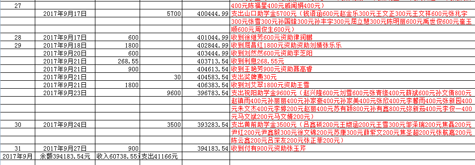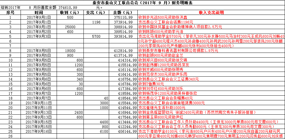 泰安市泰山义工联合会会(2017年 9 月)财务明晰表