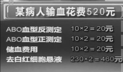 在网上公开的一份来自北大医院的病人输血单上可以看到,去白细胞红细胞悬液两份(200毫升为一份)共花费520元。其中,ABO型反测定10元,ABO型正测定10元,储存费用每单位10元,去白细胞红细胞悬液成本每单位230元。