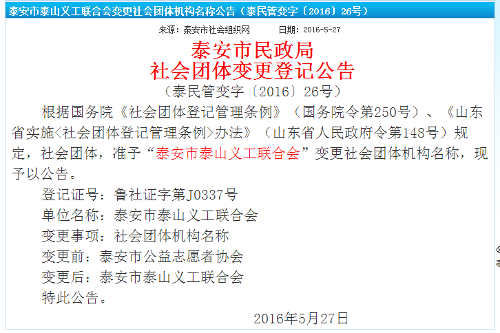 关于协会正式更名为泰安市泰山义工联合会的公告