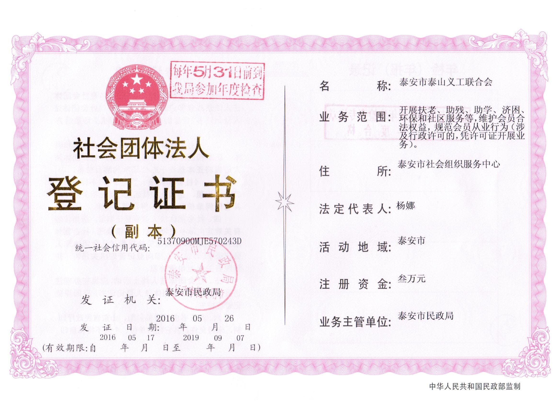 泰安市泰山义工联合会(泰安市公益志愿者协会)泰安市泰山义工联合会成立于2009年,由山东好人、泰山义工创始人崔山发起,2011年经泰安市民政局核准注册。截止2016年底发展志愿者一万余名,共建立15个分支机构,12个职能部门,八年来建立健全组织构架,各类规章制度,细化服务标准及服务内容,做到项目流程化、标准化管理。财务采用第三方财务公司监管和审计,款项公开、透明、账目清晰。