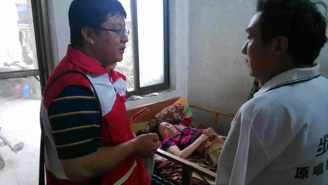 另一队由副队长贾海鹏(泰医附院),队员孙彩凤(中医推拿按摩专家),赵峰(泰医附院),志愿者苏英一行4人,一点出发沿着崎岖的山路于15:15到达黄前镇大北岭村焦安友家中,焦安友10年前因事故失去了左臂,他的妻子3年前因高处坠落造成颈椎高位截瘫,家中还有两个年幼的孩子正在上学,家中情况十分困难,医疗队各位队员带去了米面油等生活用品,孙彩凤老师给予了他们穴位按摩和相关康复训练的指导。“有大家的关心,我们一家人重拾起对生活的信心。”焦安友说。