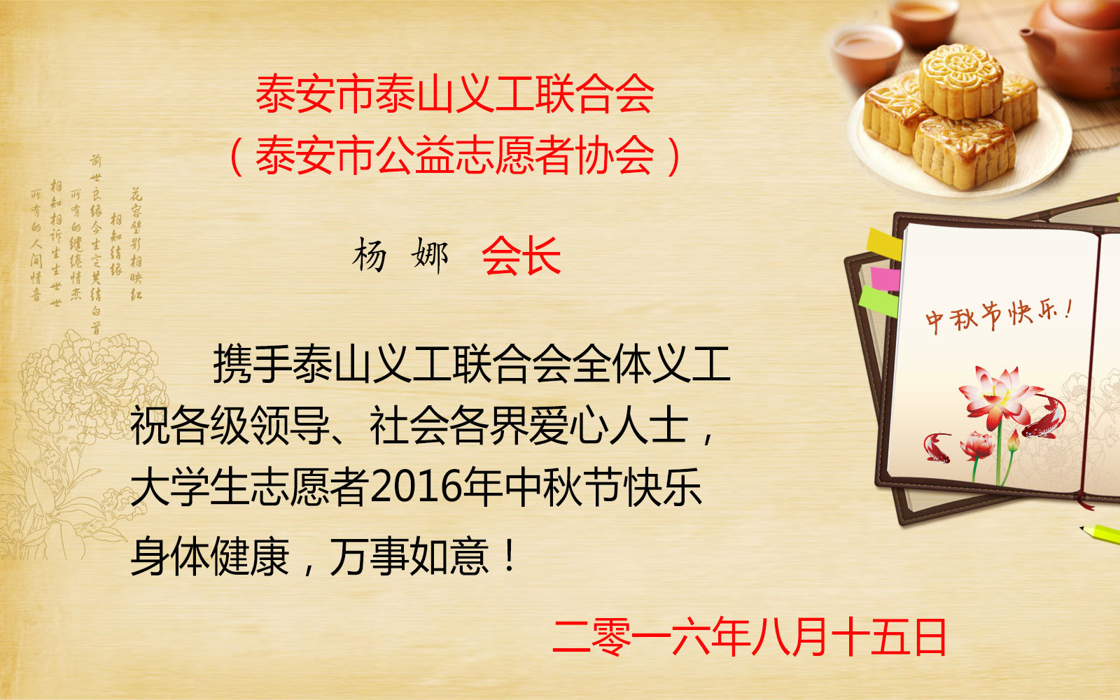 会长杨娜携手泰山义工联合会全体义工,祝各级领导、社会各界爱心人士、大学生志愿者2016年中秋节快乐!身体健康,万事如意!