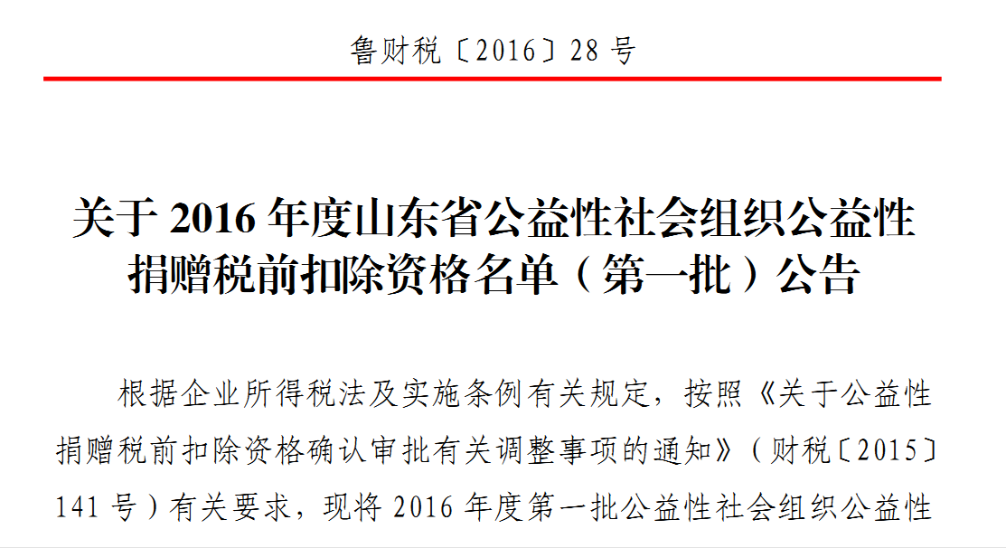 关于2016年度山东省公益性社会组织公益性捐赠税前扣除资格名单(
