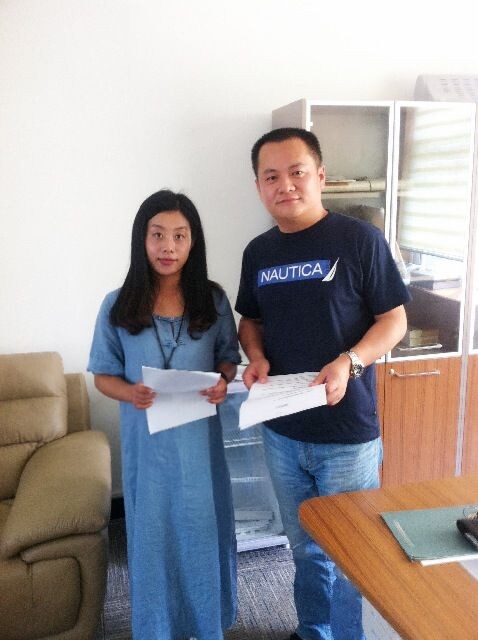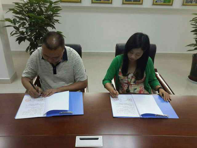 图为尚金(中国)泰安投资服务公司朱总和泰安市公益志愿者协会杨娜会长爱心捐款签约仪式