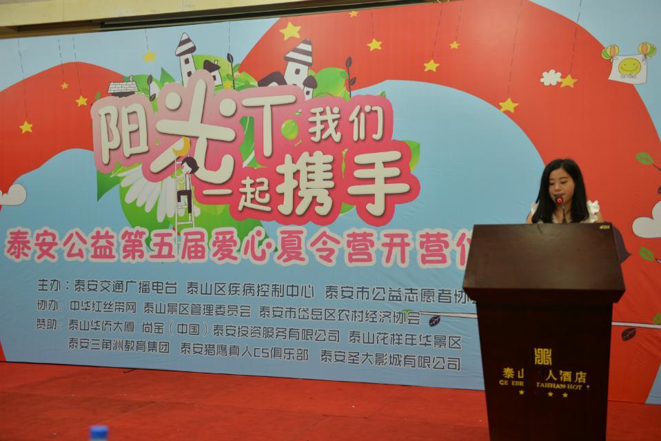 图为泰安市公益志愿者协会第五届贫困儿童夏令营开营仪式杨娜会长致词!
